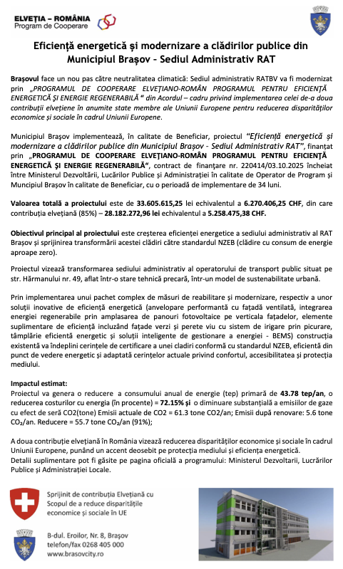 Cost total investiţie: 7.443.105,74 euro (TVA inclus), din care 79.75 % contribuţie UE şi 20.25% contribuţie Municipiul Braşov.